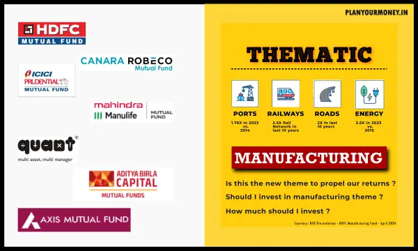 A manufacturing theme mutual fund invests primarily in companies within the manufacturing sector, such as those involved in industrial production, machinery, and raw materials processing. These funds aim to capitalize on the growth and profitability of the manufacturing industry, offering investors exposure to the sector’s potential for long-term returns. If you go by the presentation of HDFC or Mahindra, you would note that they are betting on many sectors including Power, Ports, Railways, Defence, Roads etc… The Government vision in terms of Amrit Kaal 2047, Production Linked Incentive, and Make in India getting a fillip are just some of the factors that suggests that manufacturing theme based fund may perhaps do really well.