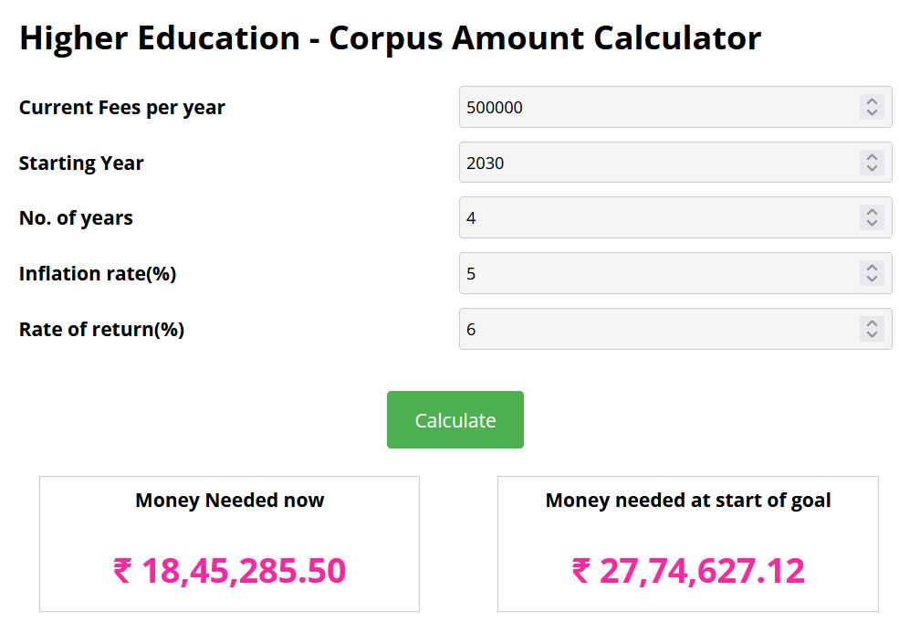 Below is a calculation of the usage of the tool for a course which starts in 2030 and the fees per year is Rs 5,00,000/-. The course fees has an inflation of 5% and if the corpus is invested in an instrument which will give a return of 6%, then the corpus that you need today is Rs 18.45 lakhs and the corpus that you need at the start of the goal is Rs 27.74 lakhs.
