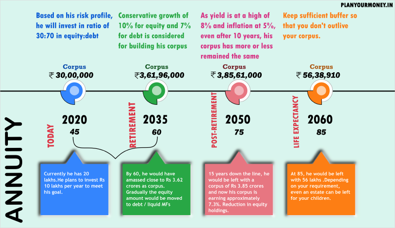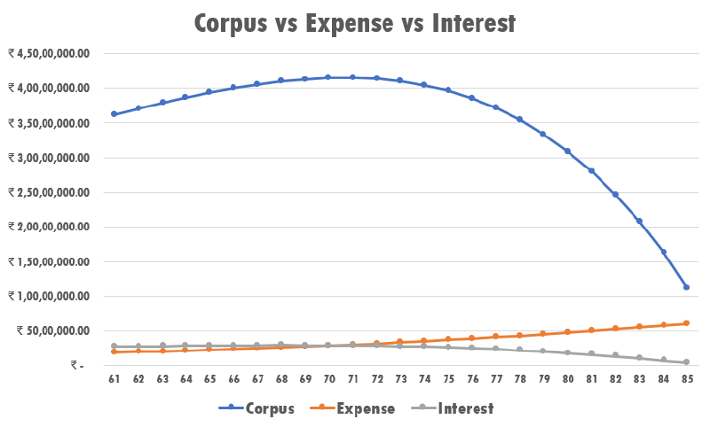 Mahesh would require a corpus of Rs 3.41 crores considering that he would receive a yield of 8% after retirement and an inflation of 5%. His expense at 60 as we found out earlier will be Rs 18,71,040 annually .