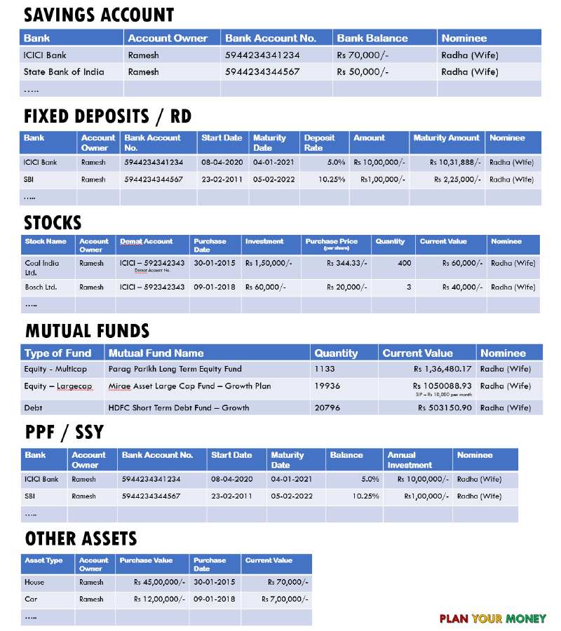 You would be able to identify your savings accounts, mutual funds, deposits, stocks etc… easily. However, you may own many more assets than you may think. In fact, this would also be useful to put it down in your will.