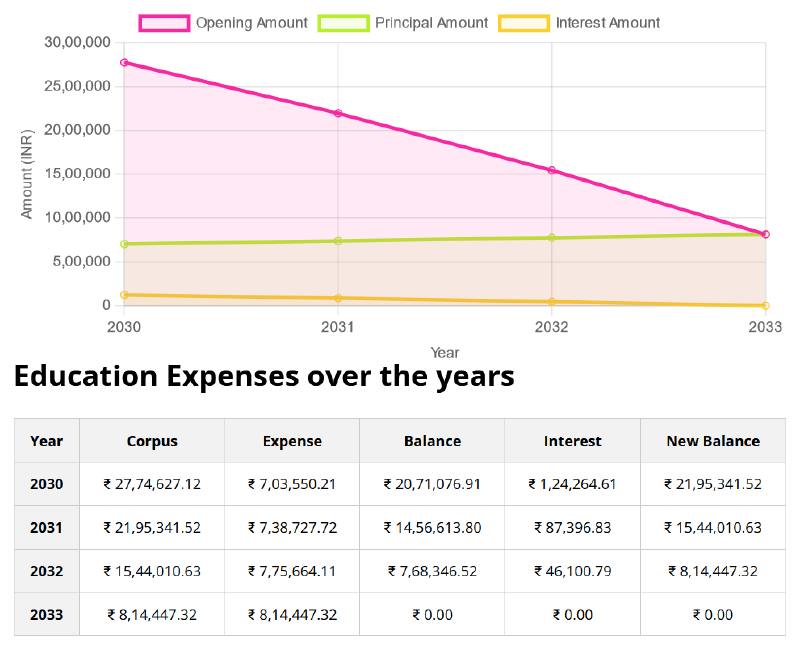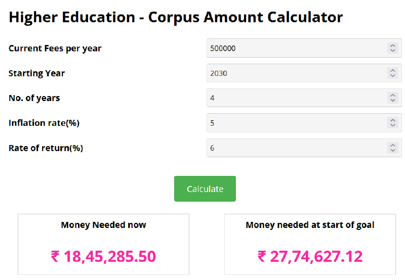 - The calculator takes the guesswork out of financial planning, providing parents with a clear roadmap to meet their child’s educational expenses. By knowing the exact amount they need to save and invest, parents can plan better and start early.