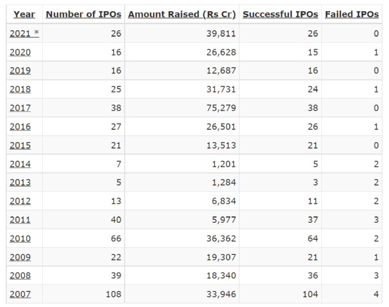 The year started with IRFC IPO. As I write this article, Zomato was listed. 5 more months to go. 26 IPO’s have been listed till date this year. 4 have been scheduled between July and September 2021. Till date, the amount raised is Rs 39,811 crore. In the last 14 years, this has been the second-highest amount raised and with 5 more months to go, we are yet to see if we are able to cross 75,000 crore raised in 2017.