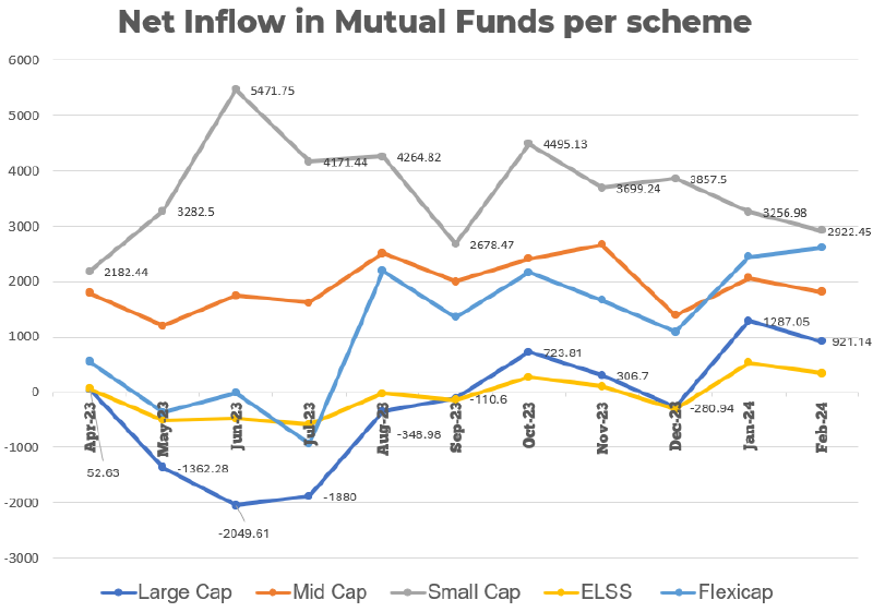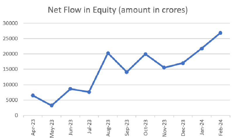 Investments in equity have mainly picked up from August 2023 onwards, however, they have been mainly flowing into mid cap and small cap funds.